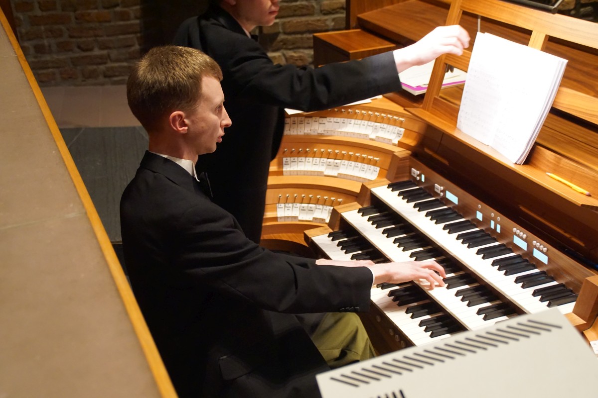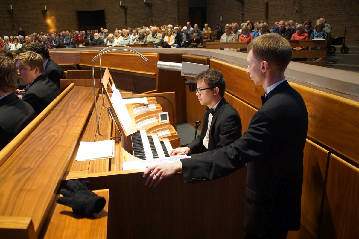 Das etwa 90-minütige Konzert spannte einen weiten Bogen von der Gregorianik, mit der das wunderbar dargebotene „Locus iste“ von Philip Stanford begann, über eine „Messe breve“ des Franzosen Yves Castagnet mit durchaus moderner Klangsprache bis hin zu bekannten Spirituals wie „Go, tell it on the mountains“. Besonders in Erinnerung dürfte den etwa 350 Konzertbesuchern die sprachliche und klangliche Präzision des Ensembles bleiben sowie die sichtbare Freude am gemeinsamen Musizieren. Exemplarisch hierfür steht das von Jeffrey Ames arrangierte afrikanische Lied „Tshotsholoza“, das das Ensemble im Zuschauerraum verteilt gesungen und damit ein ganz besonderes Raum- und Nähegefühl geschaffen hat. Abgerundet wurde das Programm mit Orgelwerken von Dietrich Buxtehude (Praeludium in C) und Max Reger (Introduktion und Passacaglia in d-Moll).
