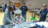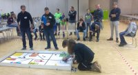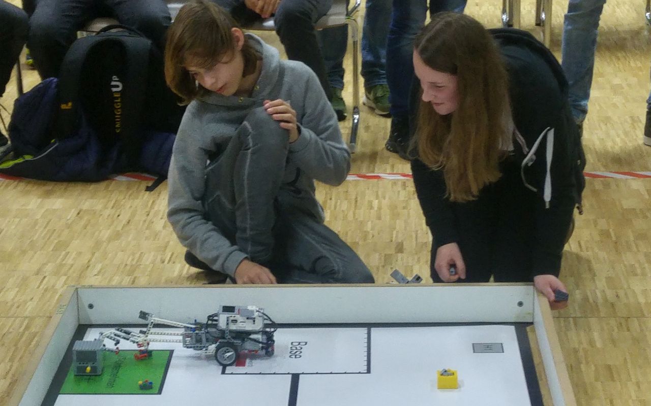 Es ging zum ZDI-Roboterwettbewerb, der dort jährlich von mehreren Schulen (vor allem) aus dem HSK bestritten wird. Ziel war es, möglichst viele Punkte durch das Erledigen von Aufgaben auf einer vorher zugeschickten Spielmatte in nur wenigen Minuten zu erledigen. Auch wenn den Teams eine lange Vorbereitungszeit gegeben wurde, um die Lego-Mindstorms EV3 Roboter passend aufzubauen und zu programmieren, ist das komplette Team angespannt.