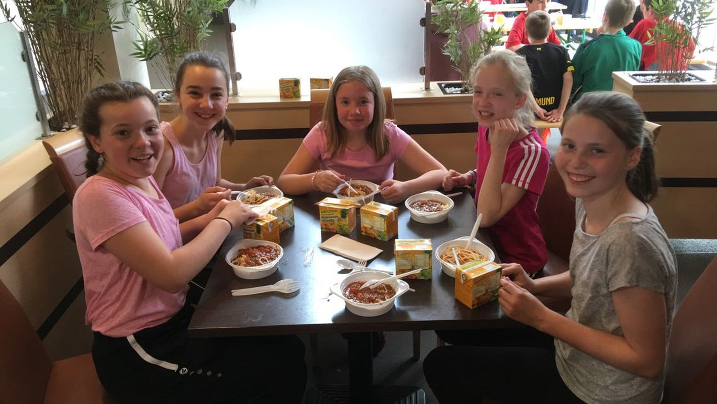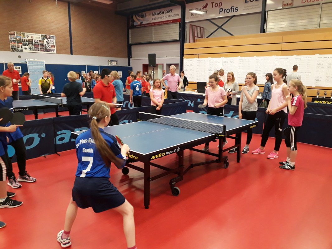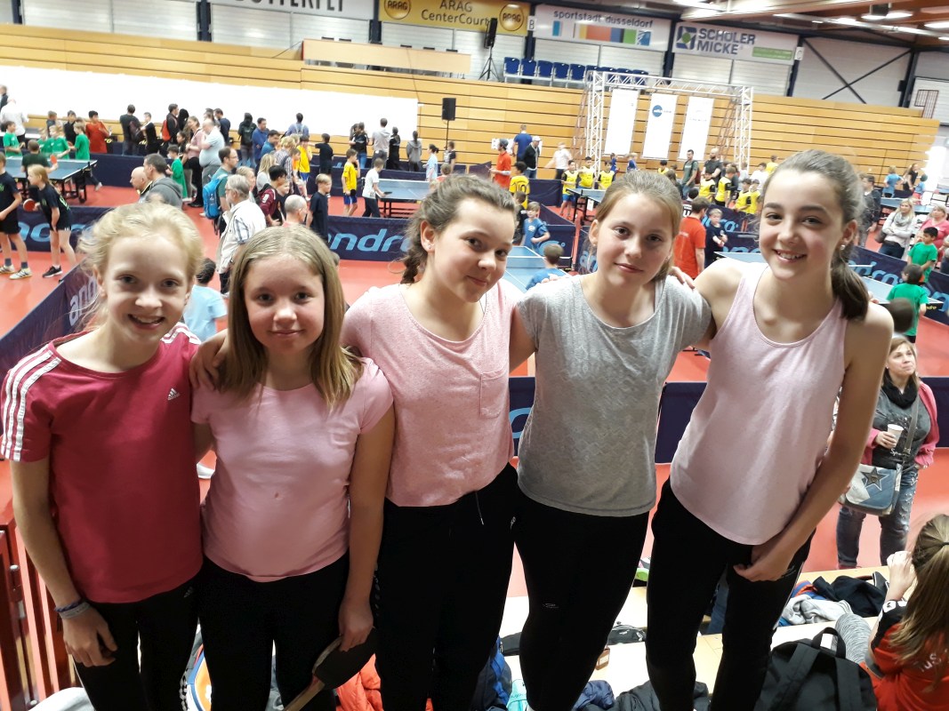 Schon früh morgens, weit vor dem üblichen Schulbeginn, fuhren Maja Hesse, Lisa Spiekermann, Hannah Tiedemann, Tilda Henderkes und Hannah Kukic in Begleitung von Frau Weber mit dem Bus nach Düsseldorf. Im Deutschen Tischtennis-Zentrum angekommen, erwartete die Mädchen die beeindruckend große Halle, in der sonst Tischtennisstars wie Timo Boll trainieren und spielen. Dieser begrüßte die aus dem ganzen Bundesland angereisten jungen Tischtennisspieler dann auch per Videogruß und wünschte allen Teilnehmern tolle Spiele und einen aufregenden Tag in Düsseldorf.