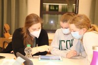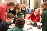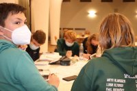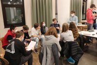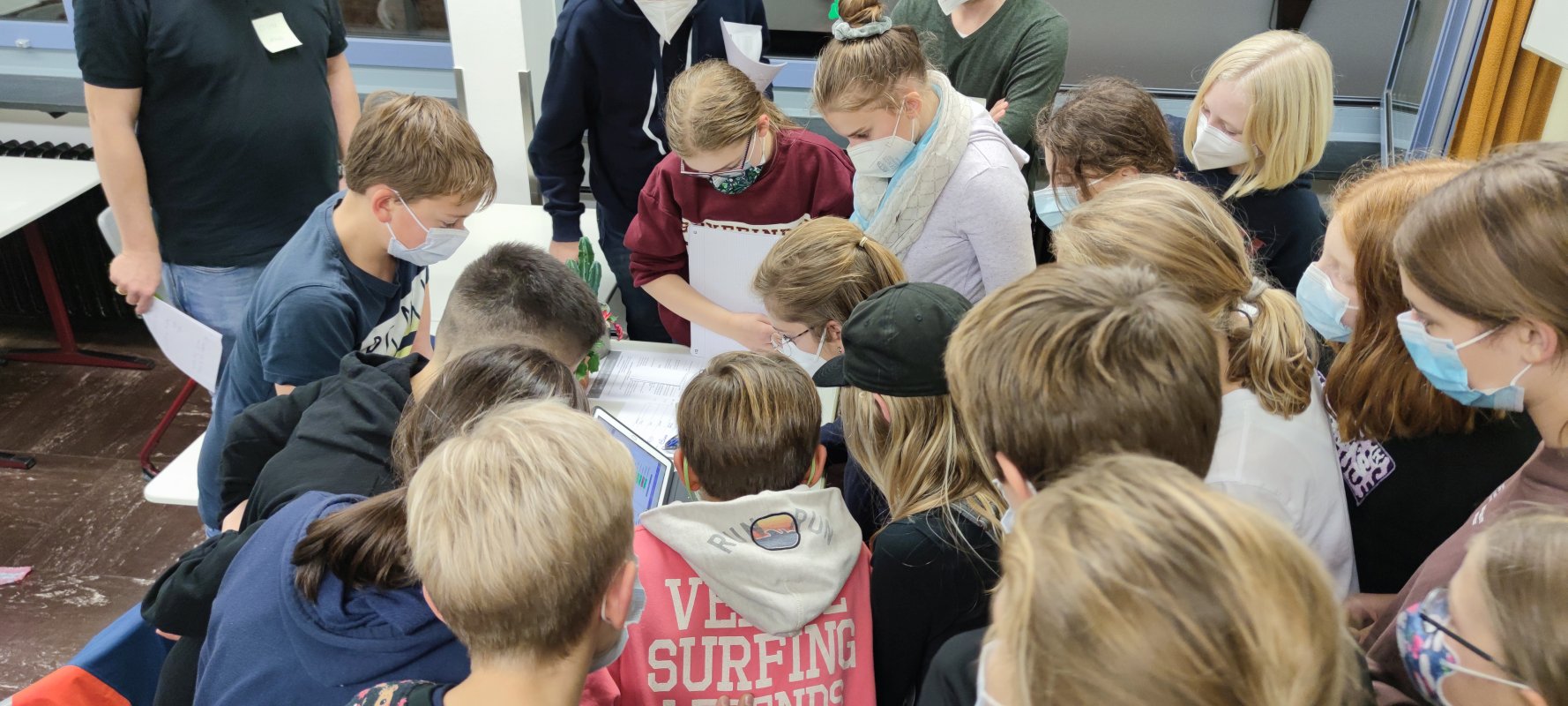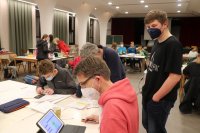 Dann ging es los. Die Fünft-/Sechst- und Siebtklässler gingen mit ihren betreuenden Lehrerinnen und Lehrern in ihre Klassenräume. Dort lagen bereits die iPads zur Bearbeitung der Aufgaben parat. Alle Gruppen ab Jahrgang 8 blieben in der Aula. Zunächst galt es die erste Runde zu schaffen. Jede Runde umfasst 10 Aufgaben, die alle korrekt gelöst sein müssen, damit die gesamte Jahrgangsgruppe eine Runde weiterkam. Das hieß für die Gruppen, dass sie sich absprechen mussten, wer welche Aufgabe bearbeitet, um möglichst schnell eine Runde weiterzukommen. Schnell entwickelte sich eine Dynamik in den Gruppen. Dabei kämpften die Klassen 5 und 6 gemeinsam um das Weiterkommen, die 7er bildeten eine eigene Gruppe, Jahrgang 8 und 9 arbeiteten zusammen sowie die EF, Q1 und Q2.