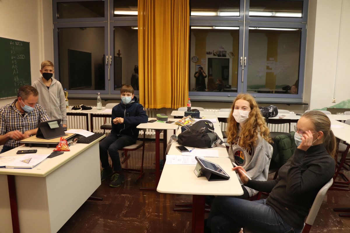 Aber der Wettbewerb war auch für unsere Schule noch nicht vorbei. In der Aula grübelten die älteren Schüler:innen noch weiter an diversen Aufgaben. Die Aufgaben hatten es aber in sich, weshalb nach vielem hin und her um etwa 23 Uhr die erste Runde für Jahrgang 8/9 endlich überstanden war und es auf in die zweite Runde ging. Auch die Oberstufe konnte schließlich in die zweite Runde wechseln. Eine Stunde wurde noch weiter geknobelt. Dabei waren nicht nur die Schülerinnen und Schüler voll bei der Sache, sondern auch alle anwesenden Mathekolleginnen und Mathekollegen bemühten sich, die ein oder andere Aufgabe noch zu lösen.