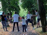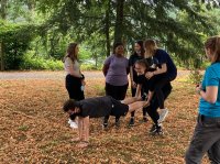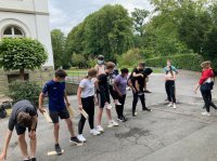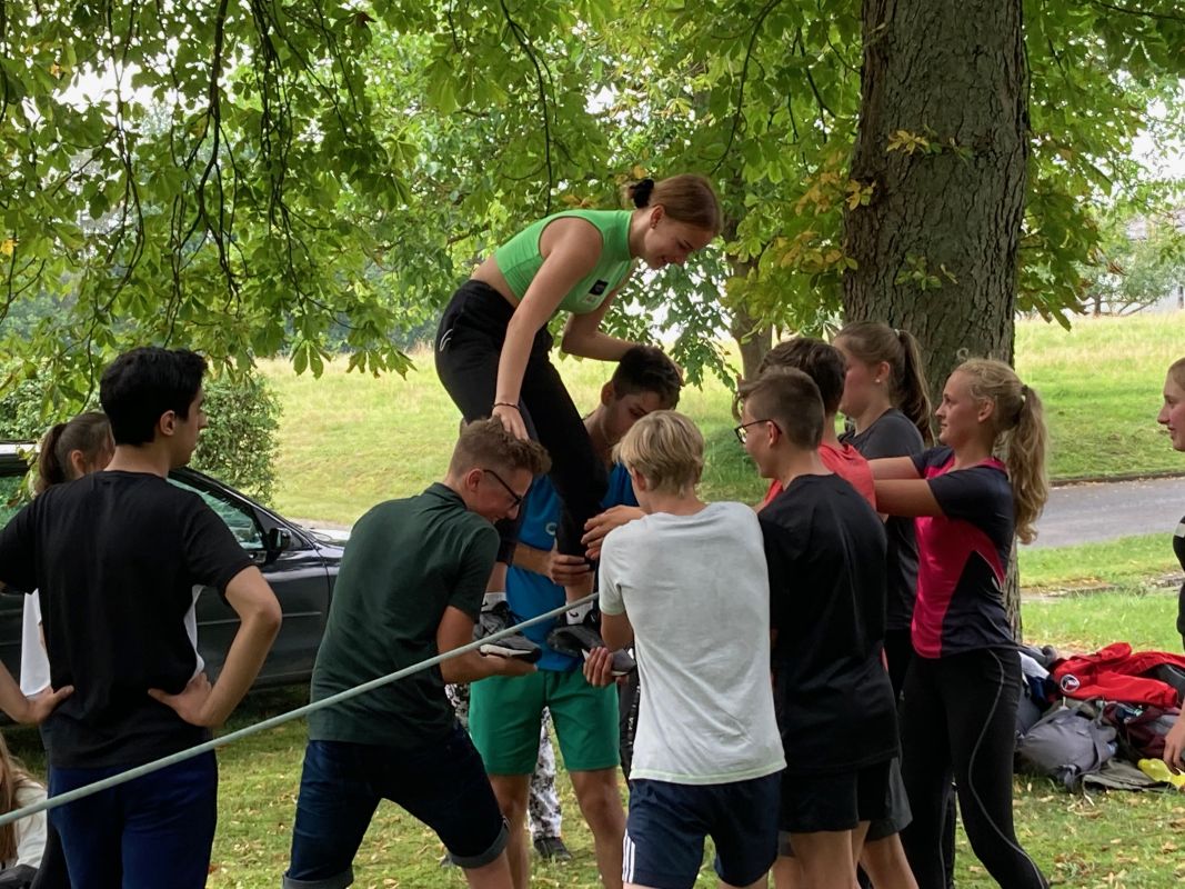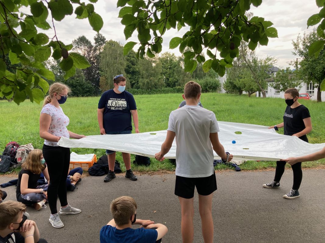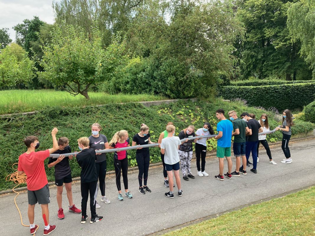 Dieser Tag stand unter dem Motto „Als Team zum Ziel“. In Kleingruppen - gemäß der Corona-Schutzverordnung - wurden unsere Jugendlichen von acht Erlebnispädagogen vor außergewöhnliche Herausforderungen gestellt. Es gab viele Aufgaben, die von den Teams und jedem Einzelnen verlangten, sich mit der eigenen Rolle und der Gruppe auseinander zu setzen. Obwohl es an diesem Tag sehr warm und schwül war, waren alle mit Eifer bei der Sache. Nach einem ausdrücklichem Lob an alle Schülerinnen und Schüler verabschiedeten sich die Pädagogen mit dem Worten: „Hoffentlich sagt ihr im Jahr 2023: Wir haben das Abitur geschafft!“ Anschließend genoss man im Schulgarten die wohlverdiente eiskalte Cola (und auch andere „gesunde“ alkoholfreie Getränke) sowie leckere Grillwürstchen im Brötchen. Die Stimmung war gut!