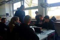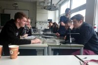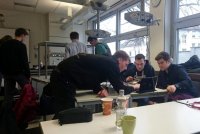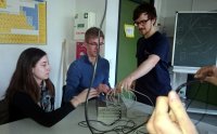 Nach einer interessanten Präsentation waren wir gespannt, die Partikel, die aus den Weiten des Universums auf die Erde zurasen, selbst an Experimenten zu beobachten. Mit Laptops und anderen Messgeräten ausgestattet haben wir in Kleingruppen Experimente gestartet, die mindestens 1 Stunde laufen mussten, um nennenswerte Ergebnisse zu liefern. Die Nebelkammer als krönender Abschluss des langen Tages half dann erstmals zur Visualisierung der ansonsten unsichtbaren Teilchen, die uns doch tagtäglich umgeben und vor allem mit fast 300.000.000 Meter / Sekunde an uns vorbeischießen.