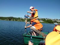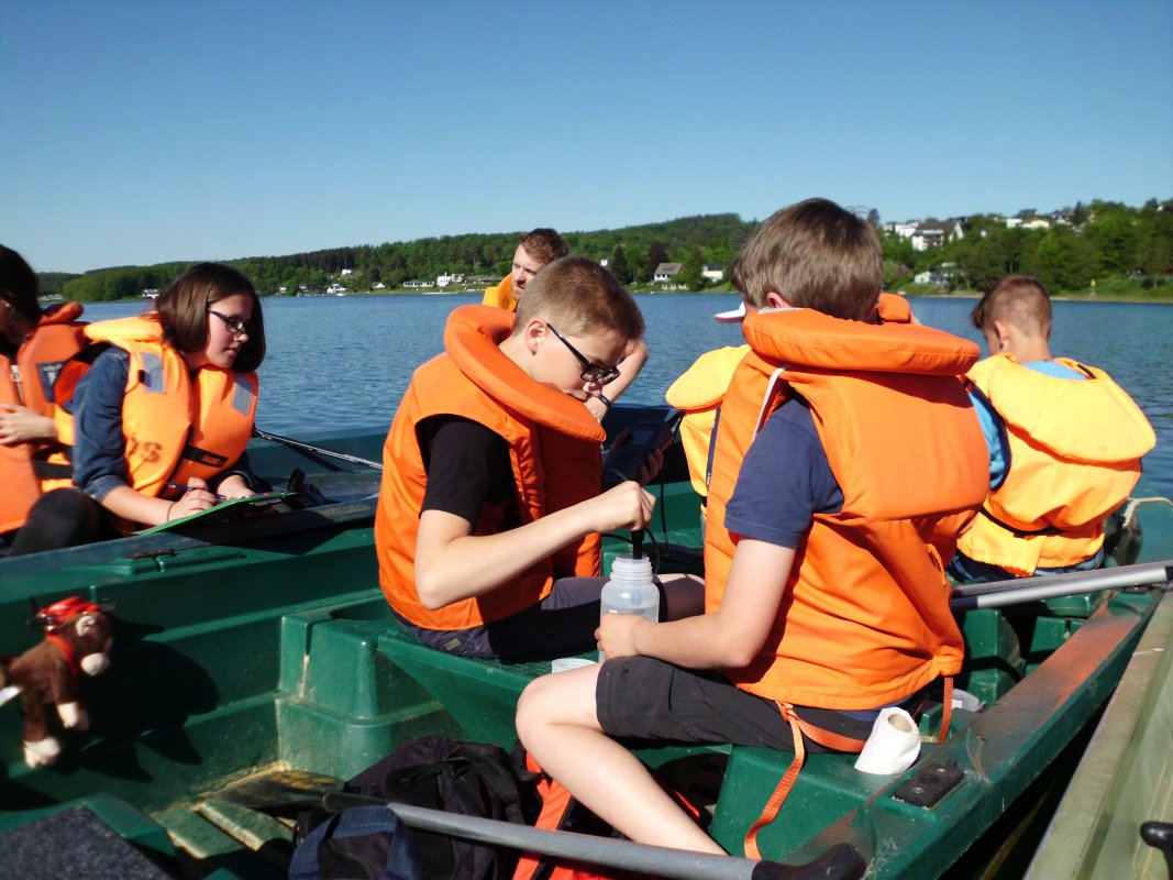 Am Dienstagmorgen bestritten wir nach dem Frühstück ein echtes Abenteuer auf hoher See, um die Wasser- und Planktonproben des Hauptbeckens zu nehmen. Für viele von uns war das das Highlight der Fahrt, denn wir mussten jeweils in Vierer- oder Fünfergruppen in kleine Paddelboote steigen und bis zu einer bestimmten Boje auf dem Stausee paddeln. Dort verbanden wir die Boote miteinander, sodass wir als lange Kette über den Sorpesee trieben und unsere Proben entnehmen konnten.