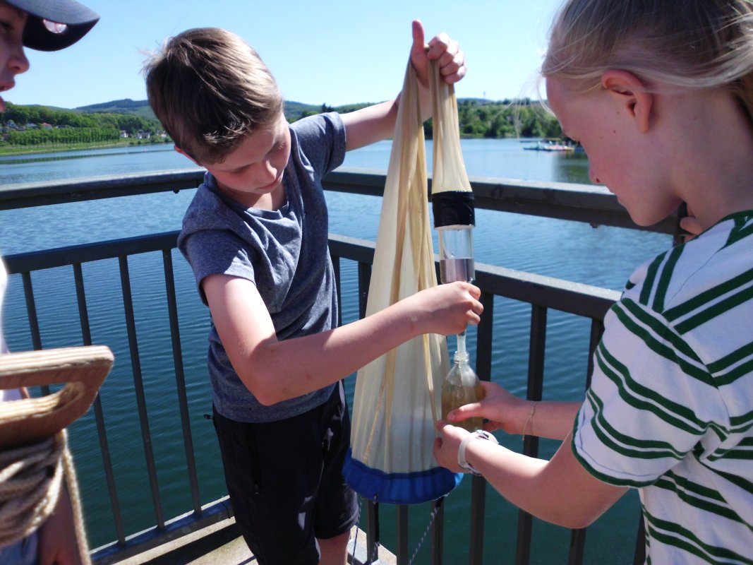 Nach dem Mittagessen fuhren wir mit der MS Sorpesee zum Vorbecken nach Amecke, um dort die ersten Wasserproben zu nehmen. Unter anderem wurden die Temperatur, der pH-Wert, der Sauerstoffgehalt und die Sichttiefe gemessen, und eine Gruppe fing mit einem speziellen Netz Plankton und Kleintiere. Außerdem entnahmen wir Wasserproben aus verschiedenen Tiefen des Sees. Wieder zurück in der Jugendherberge erläuterte uns Herr Schelte das weitere Vorgehen.
